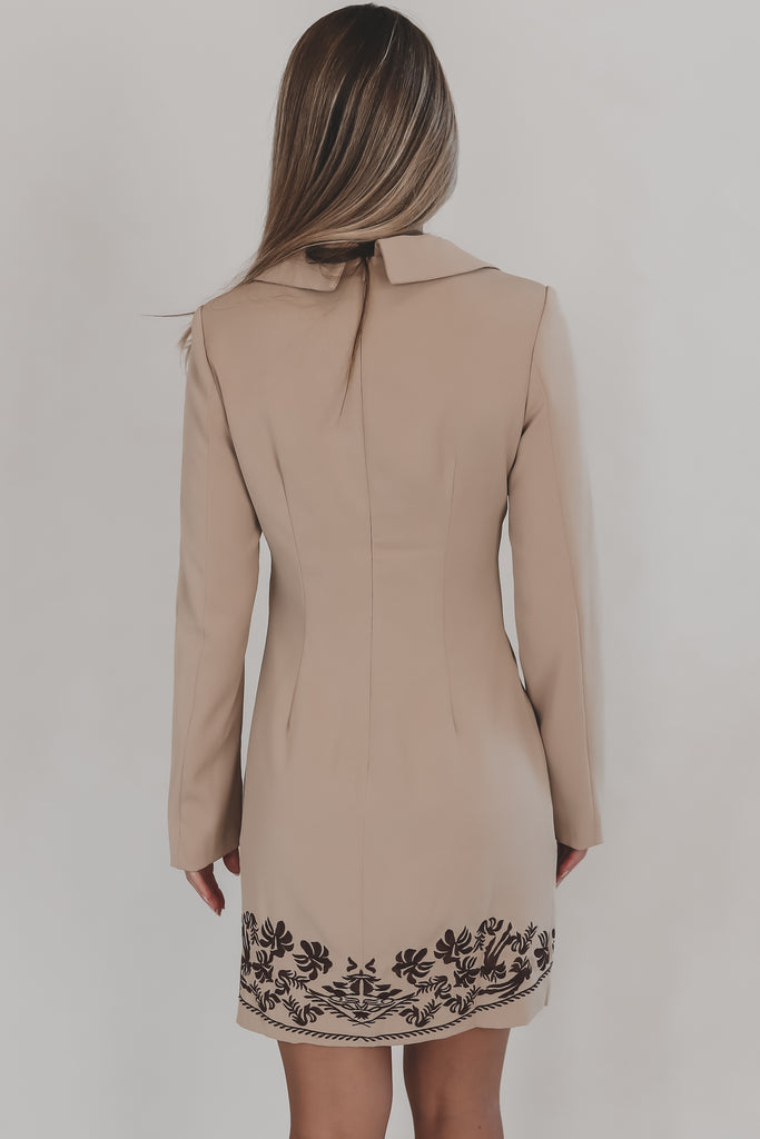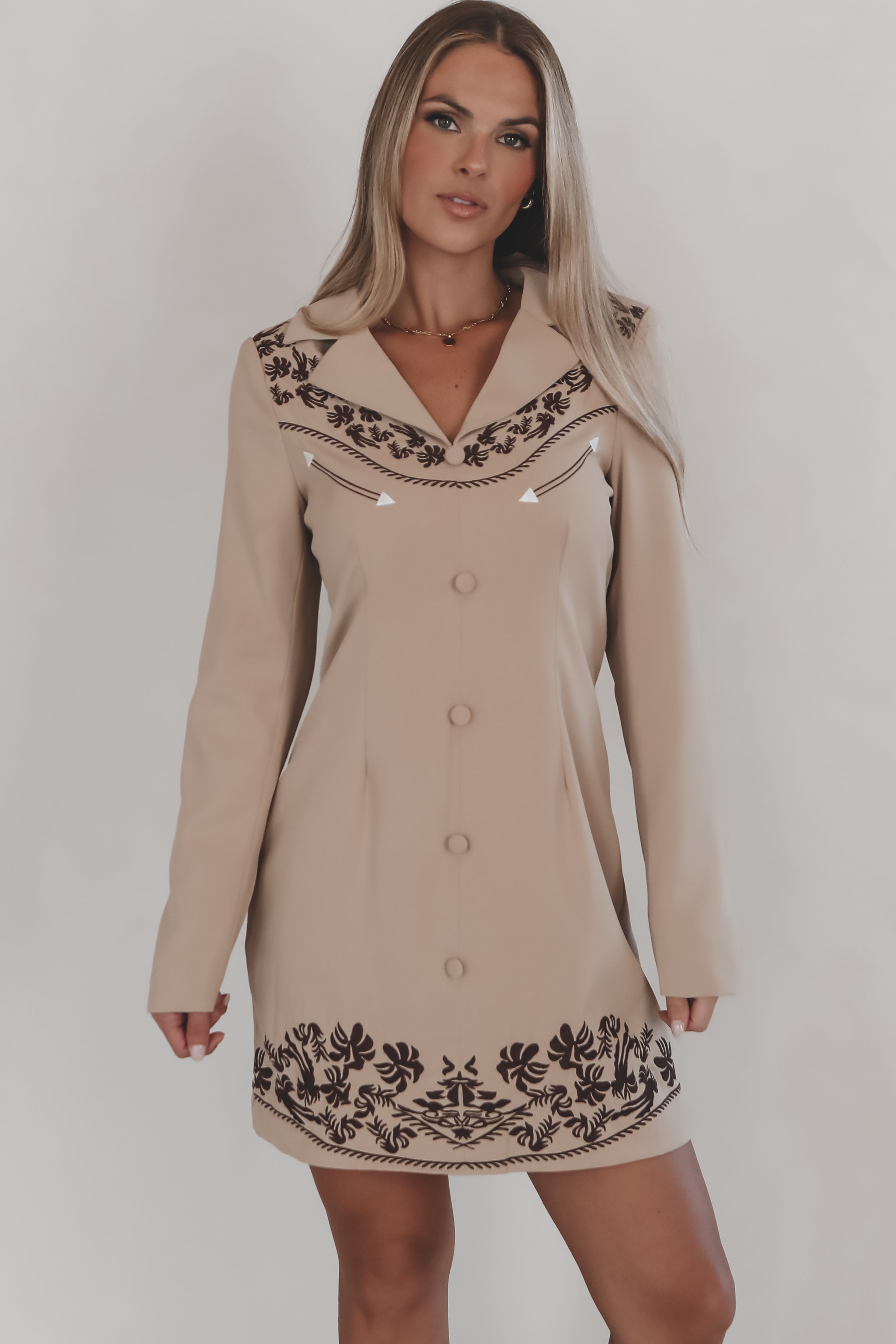 • Tan long sleeve western blazer mini dress, zipper closure in the back, not lined