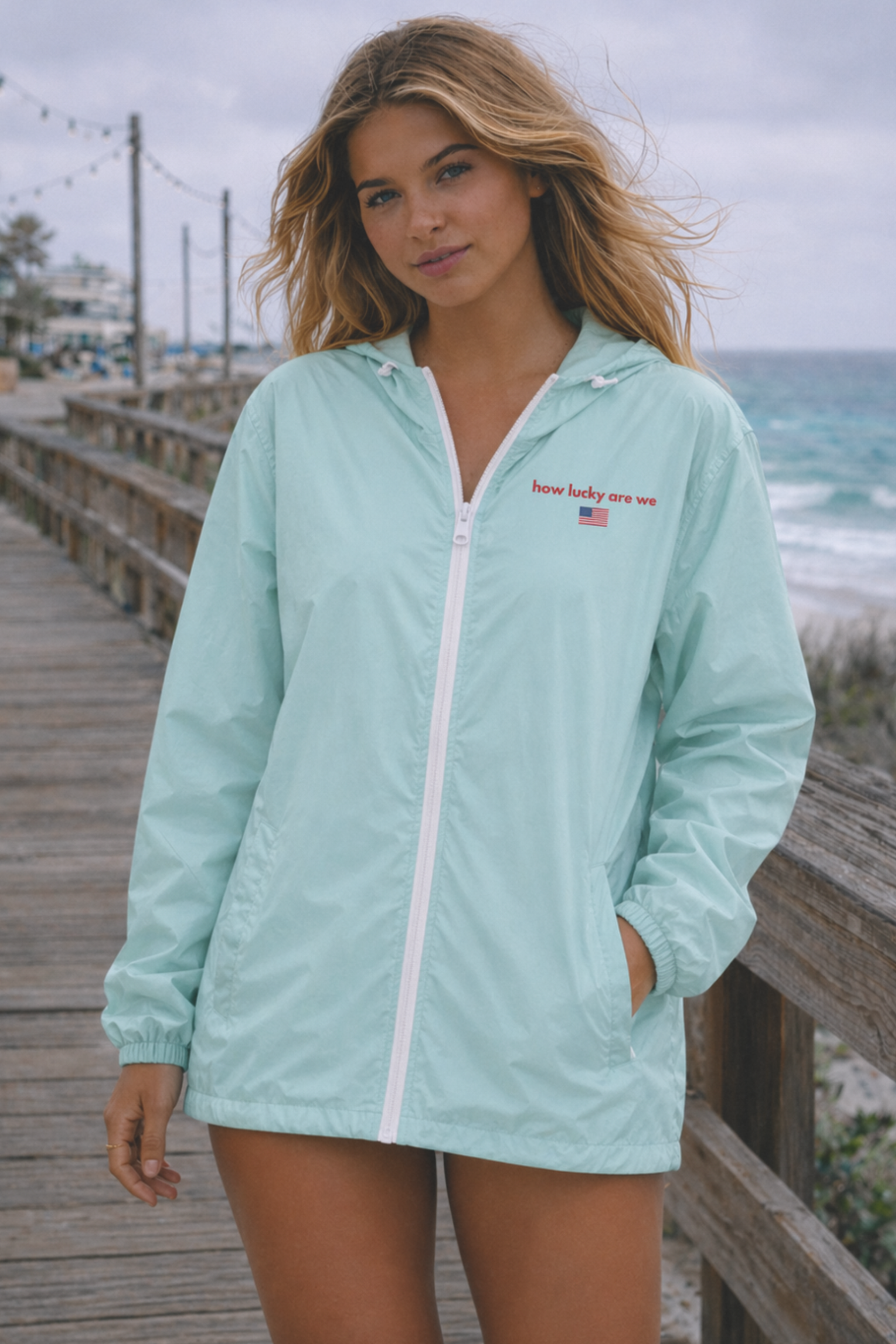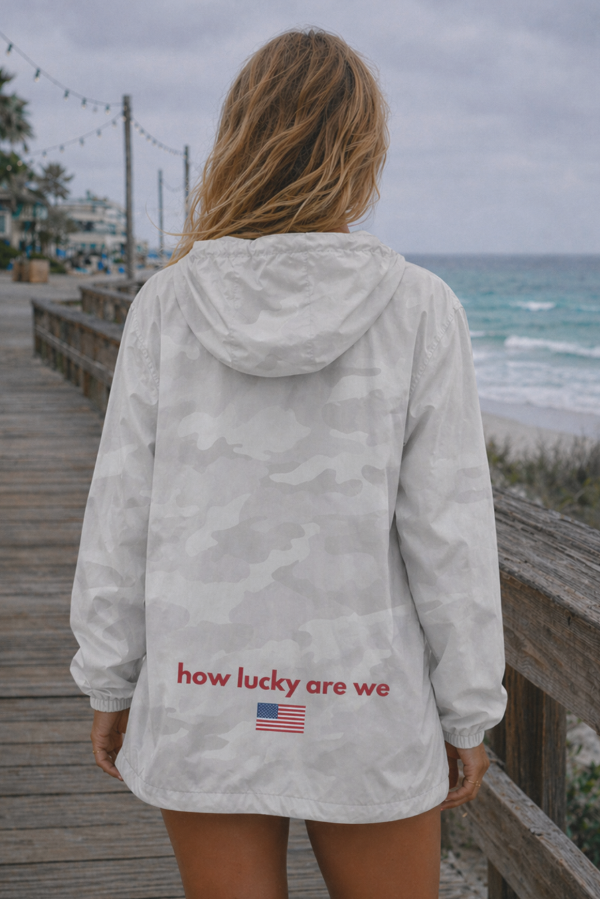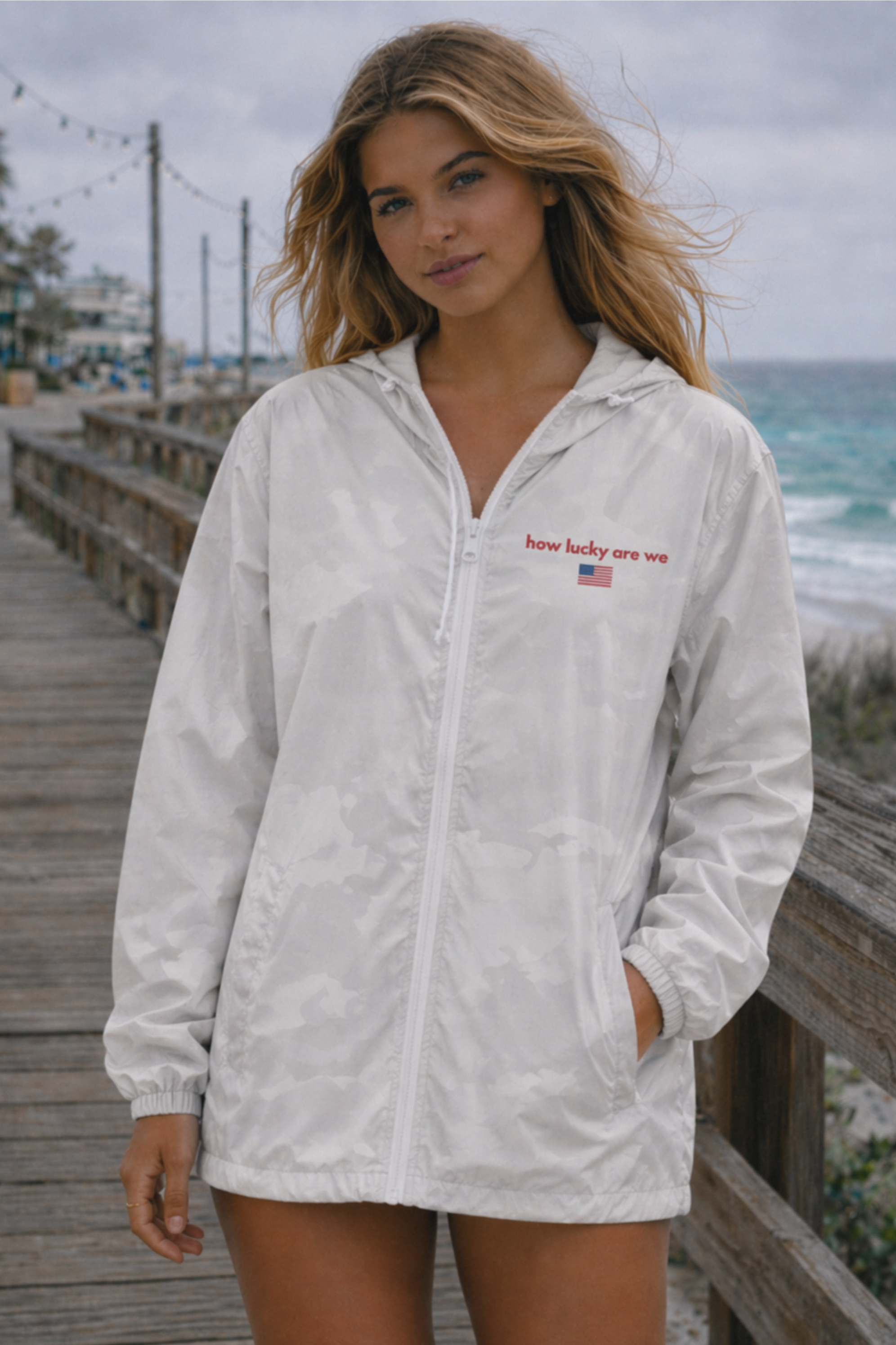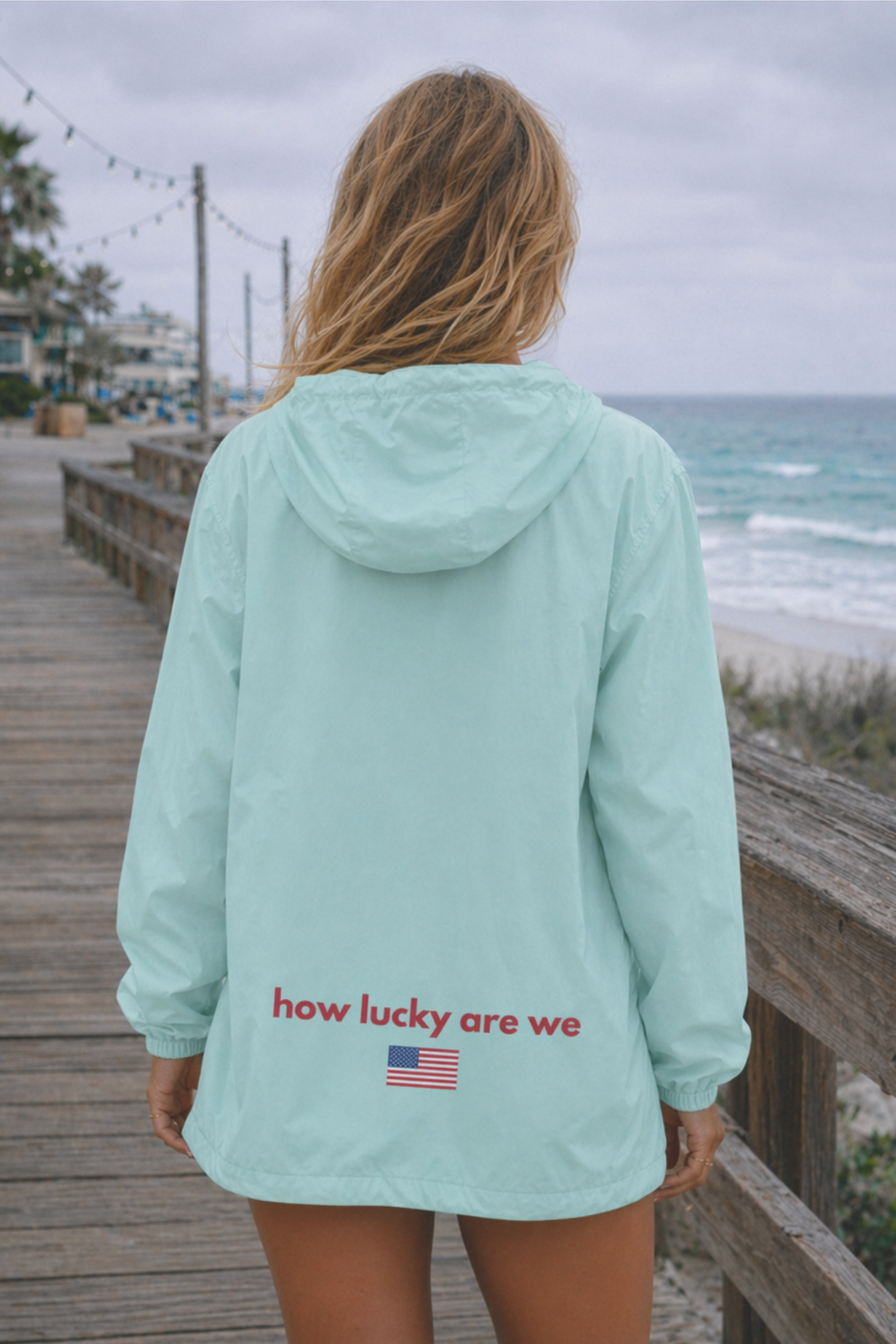 Lightweight, effortless, and made for life by the water—this windbreaker is your go-to layer for breezy beach days and coastal travel. Featuring a minimal “how lucky are we” graphic with a subtle flag detail, it brings a soft patriotic touch to a clean, everyday silhouette.