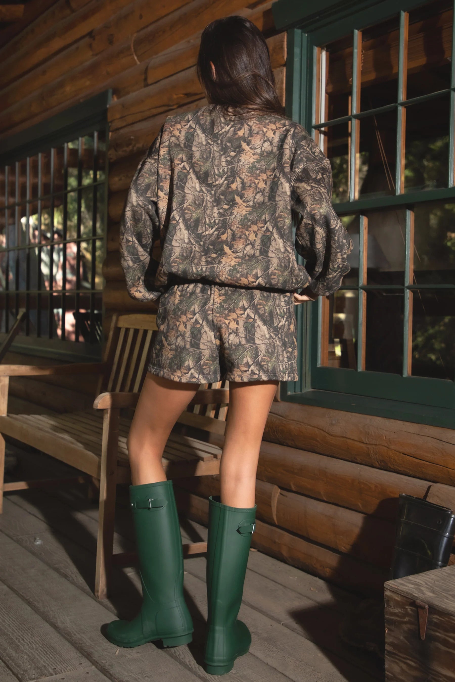 Dark Woodland Camo Fleece Crew Neck Sweatshirt brings bold comfort in an oversized silhouette.