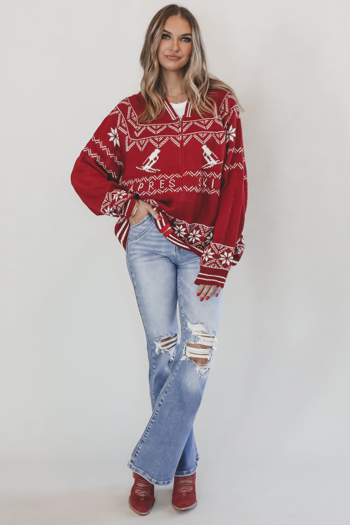 Planning a weekend getaway to the mountains? Let us plan your outfit. This knit zip is a fun and festive addition to your winter wardrobe!!