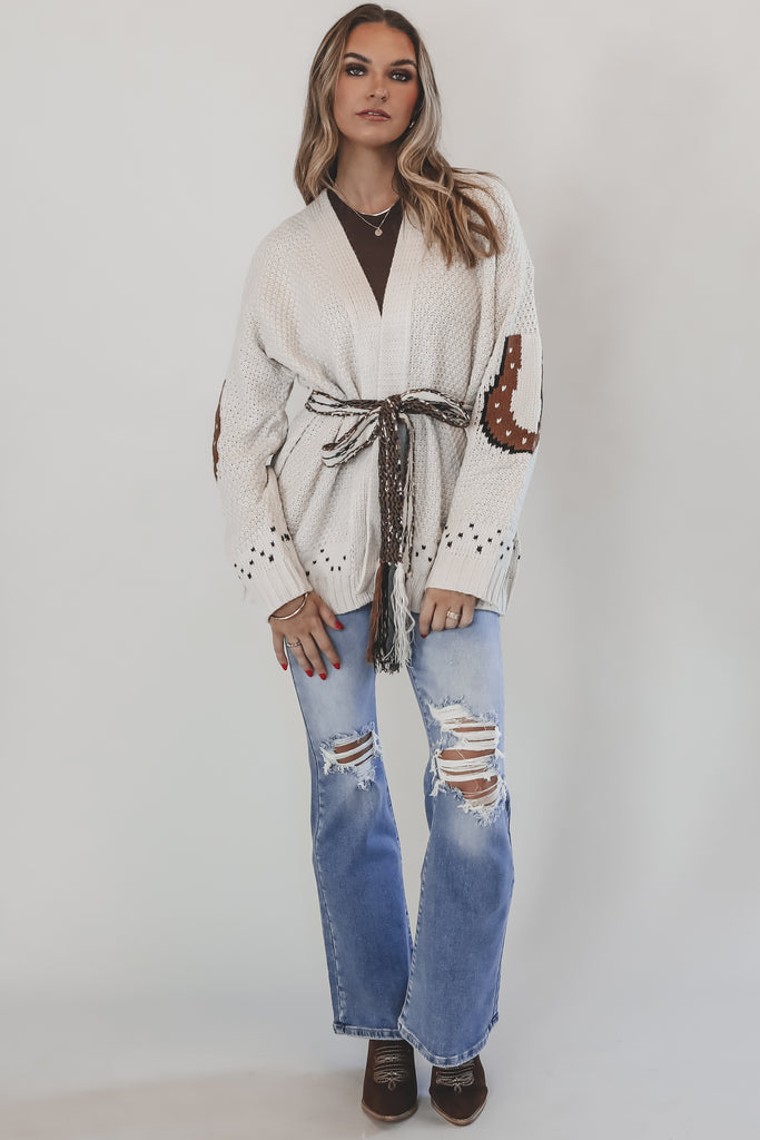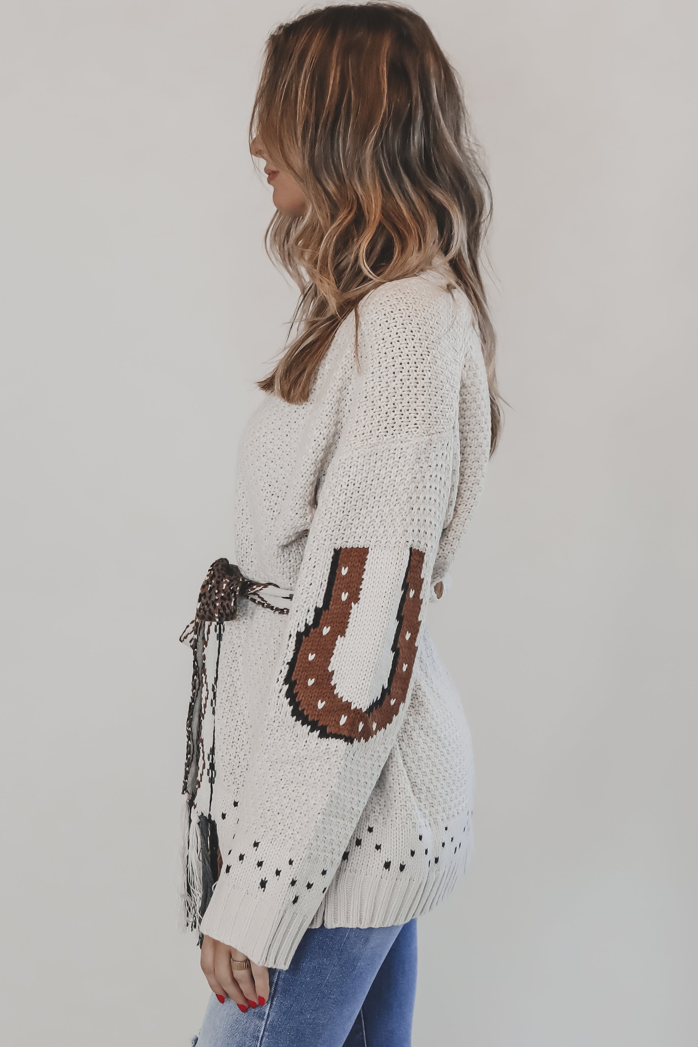 - Knit cream sweater, belted, horseshoes on the elbows, embroidered horse on back