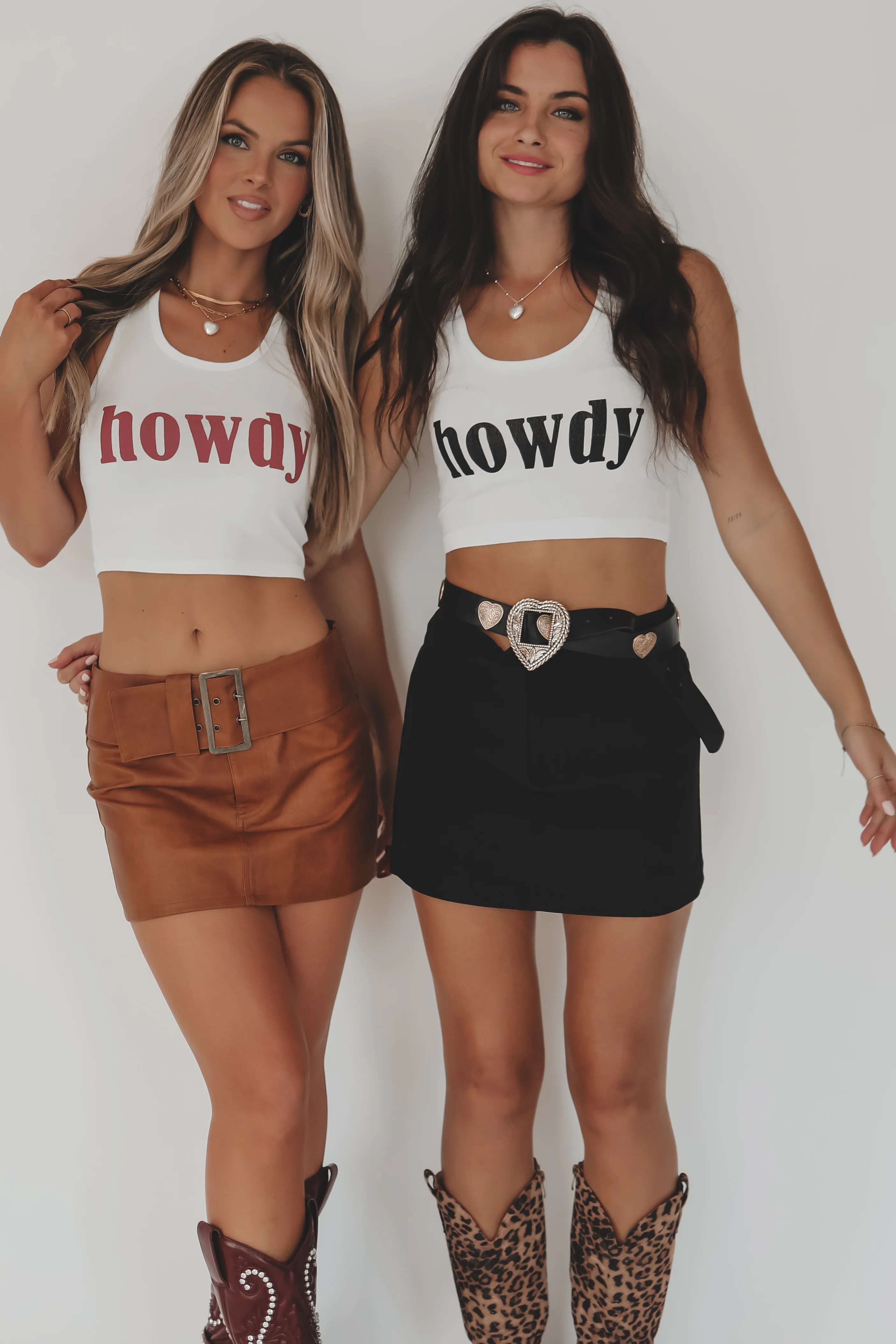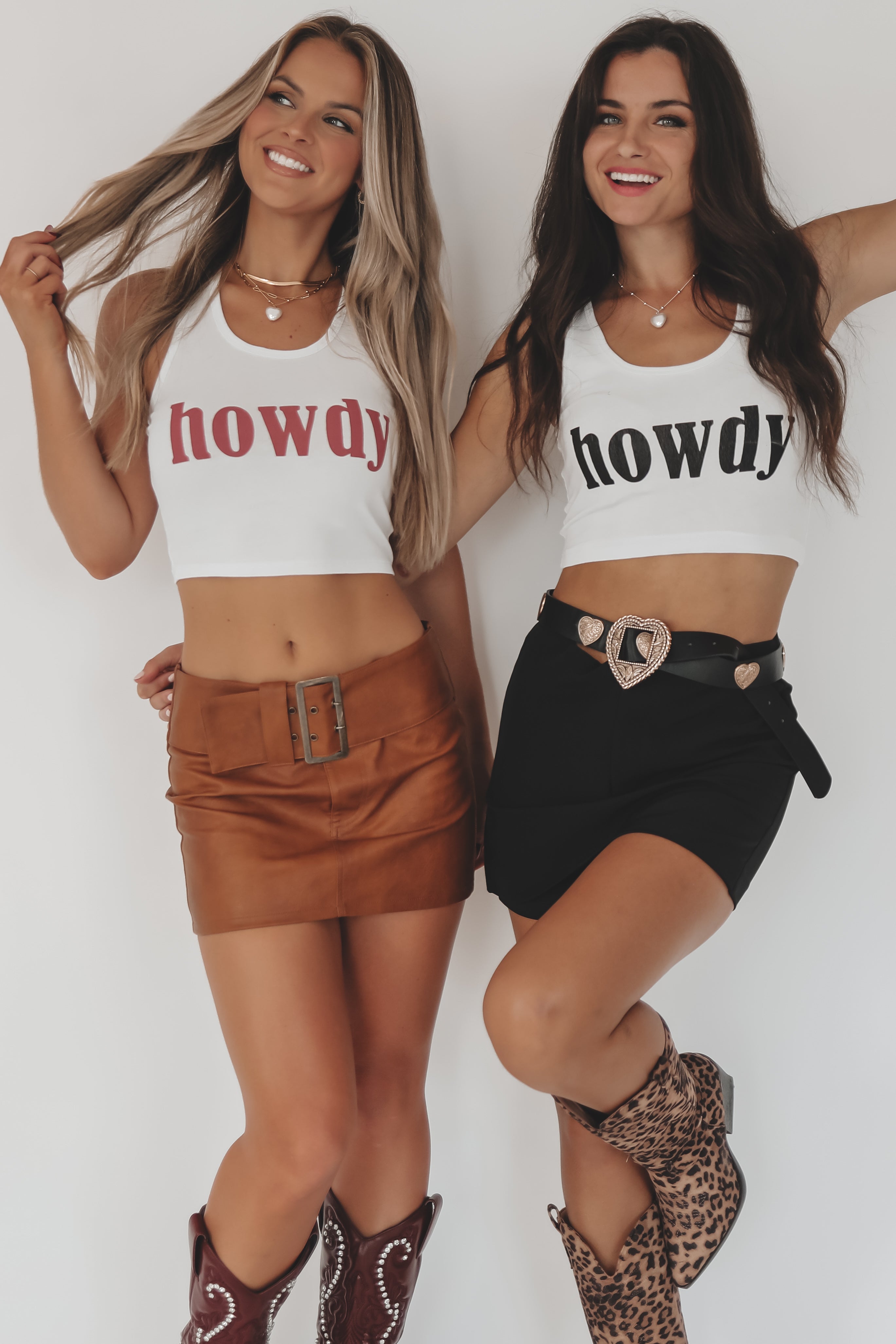 - White fitted cropped tank, HOWDY written on the front in a faded red color, back is blank
