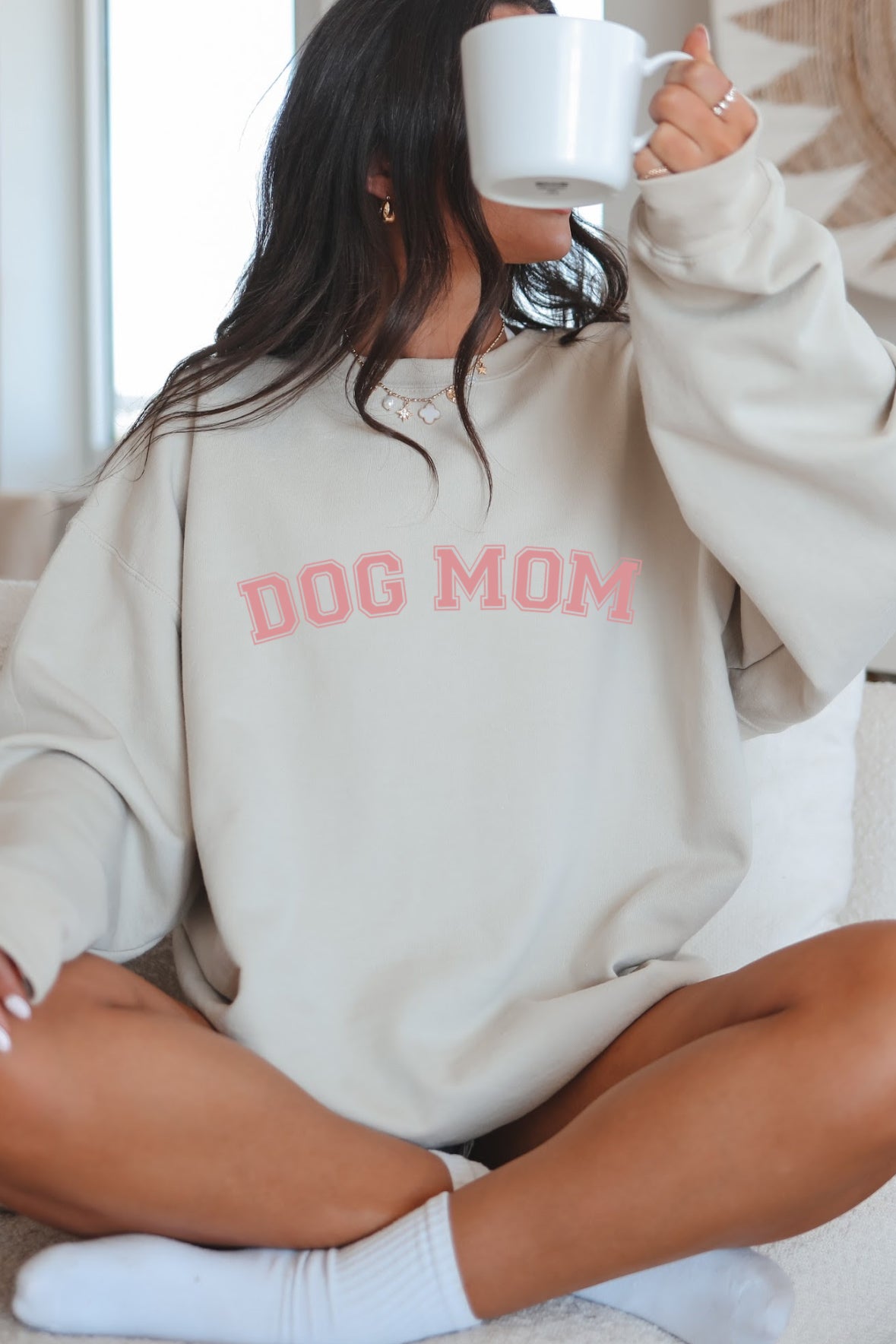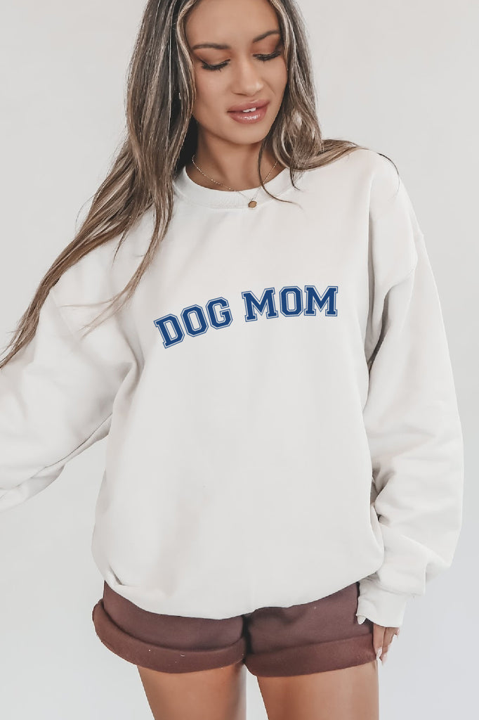 • Ultra soft ivory crew neck sweater top, comes in light pink or or navy blue Dog Mom on the front, back is blank