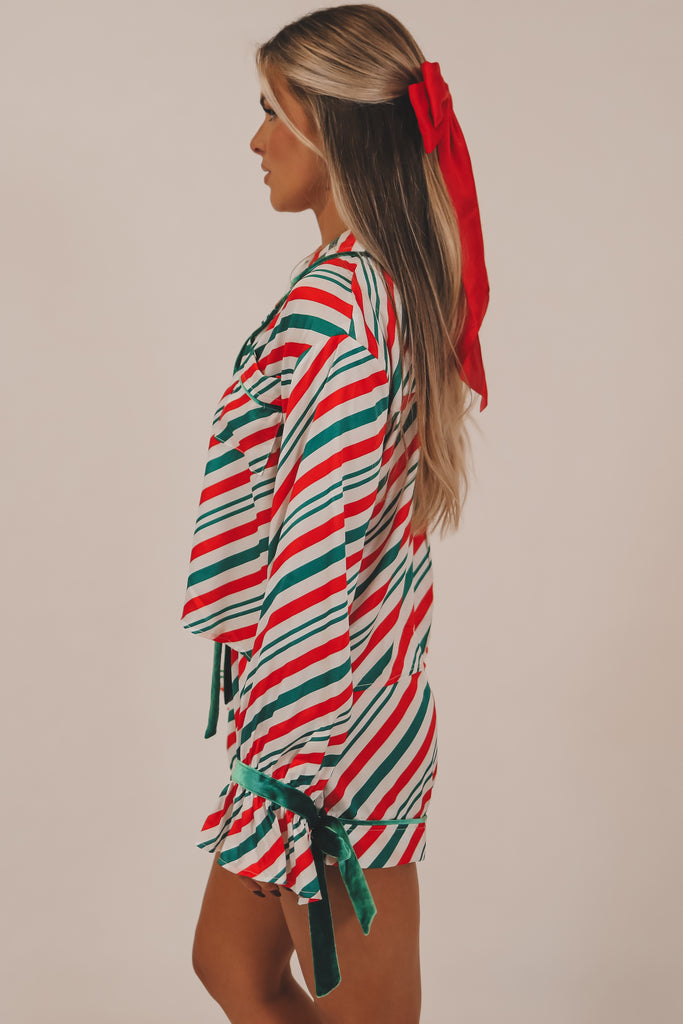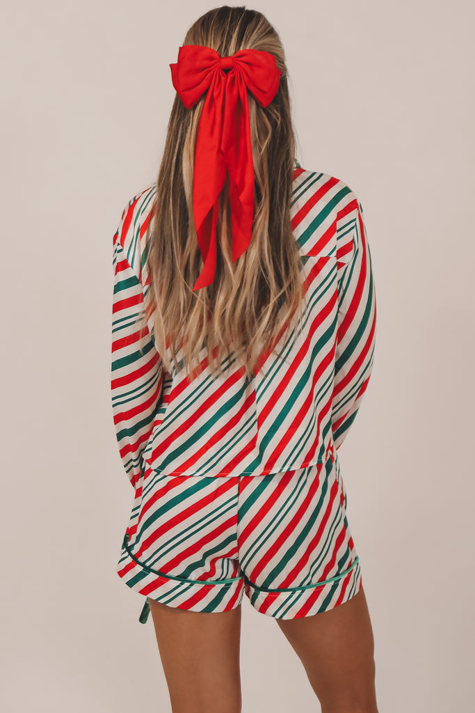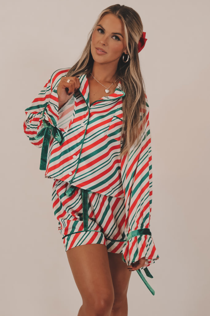 - Christmas Morning Pajamas - Red, white, and green candy cane striped satin long sleeve top and shorts pajama set