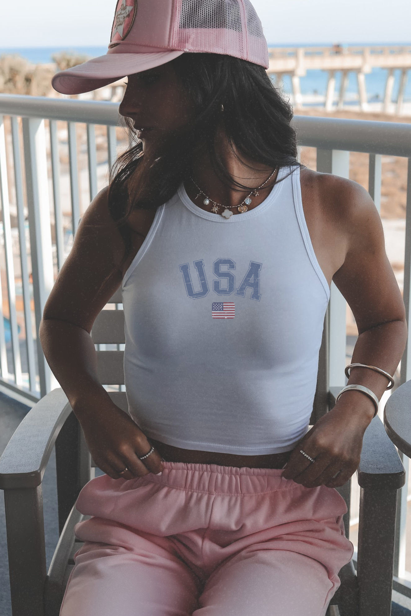 Clean, classic, and made for all-American summer daysāthis USA crop tank features a minimal collegiate-style graphic with a subtle mini flag detail. Designed with a flattering, fitted silhouette, it delivers that effortless preppy coastal look that works from beach days to casual outings.